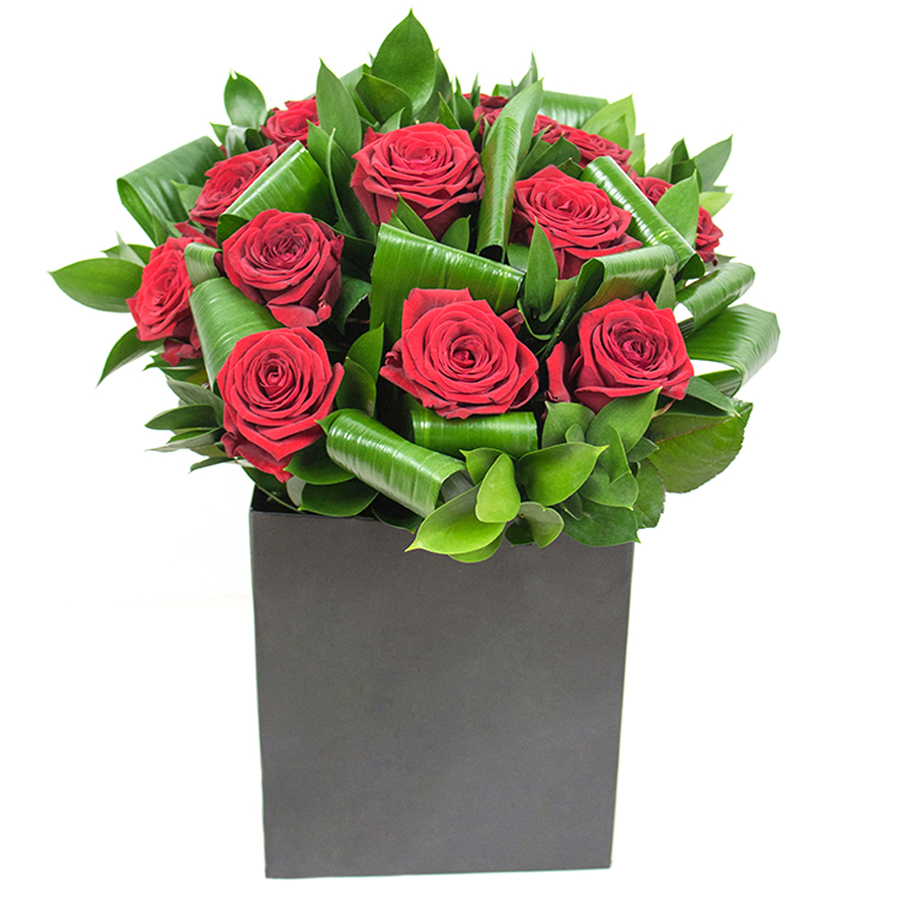 Admire the beauty and sophistication of our bouquet, featuring vibrant red roses intertwined with aspidistra leaves and ruscus. This unique arrangement is designed to enhance any space with its graceful presence.